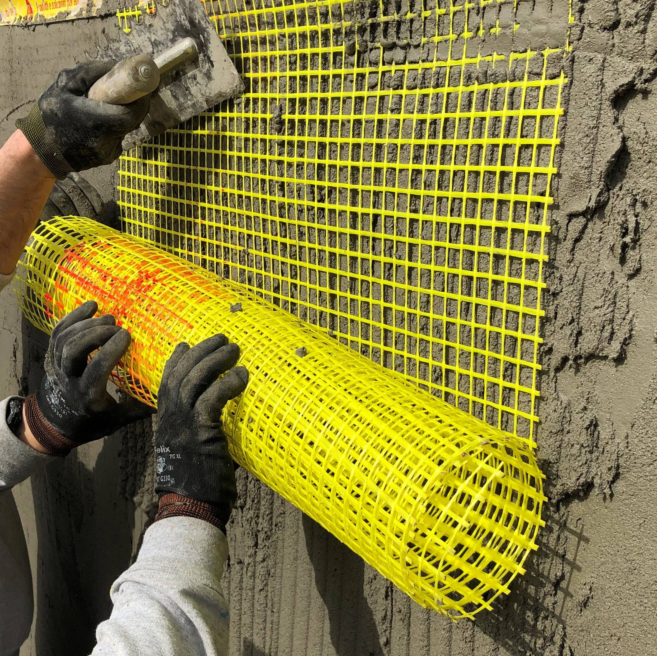 Rete di armatura biassiale ARV 100 Kerakoll in fibra di vetro alcali‑resistente e aramide, specifica per il rinforzo, il miglioramento e l’adeguamento antisismico in basso spessore di edifici in calcestruzzo armato, con tamponature in laterizio, e strutture in muratura.