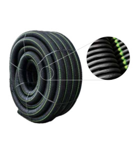 Tubo drenaggio corrugato di polietilene fessurato a doppia parete, liscia internamente e corrugata esternamente, di colore nero ad elevata resistenza ai raggi UV.