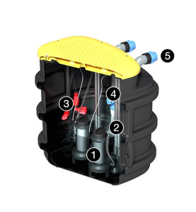 La stazione di sollevamento Teknosol a doppia pompa è dotata di un serbatoio di accumulo in polietilene lineare ad alta densità (LHDPE), resistente alla corrosione e di grande durata. Integra due pompe sommerse con girante a vortice per garantire la continuità del servizio in caso di guasti o portate elevate. La gestione dell’accensione e dello spegnimento avviene tramite galleggianti automatici e un quadro elettrico di controllo.