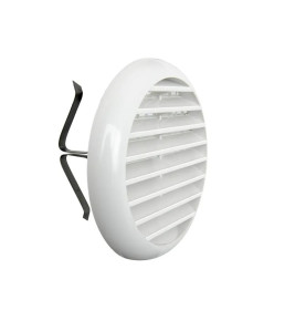 griglia di ventilazione in plastica diametro 106 mm, con molle di fissaggio. Idonea per fori di ventilazione da diametro 40 mm a 80 mm. Passaggio aria 40 cm². Completa di rete antinsetto. Colore bianco.